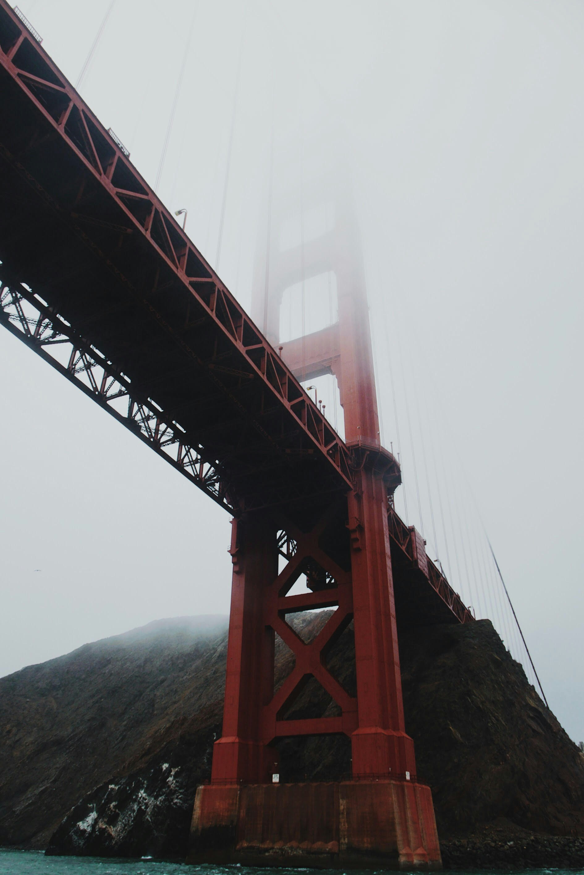 worm's-eye-view of Golden Gate Bridge covered by fog