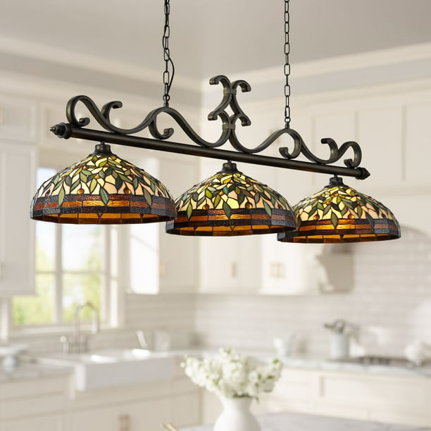 Robert Louis Tiffany Bronze Linear Island Pendant Chandelier 56" Wide Tiffany Style Leaf and Vine Art Glass 3-Light for Kitchen