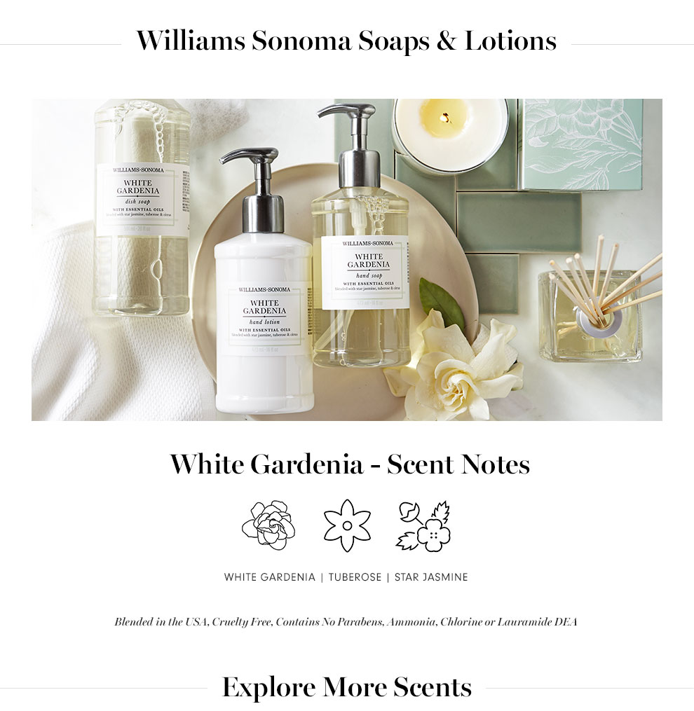 Williams Sonoma Hand Lotion, White Gardenia | Williams ... Williams Sonoma White Gardenia Hand Soap Refill, 68 oz. $ 64.95. Williams Sonoma White Gardenia Fragrance Diffuser $ 42.95. Williams Sonoma White Gardenia Hand Soap & Lotion 3-Piece Set $ 55.95 - $ 81.95. Williams Sonoma White Gardenia Dish Soap $ 21.95 - $ 70.95. Williams Sonoma White Gardenia Dish Soap Refill, 68 oz. $ 57.95.