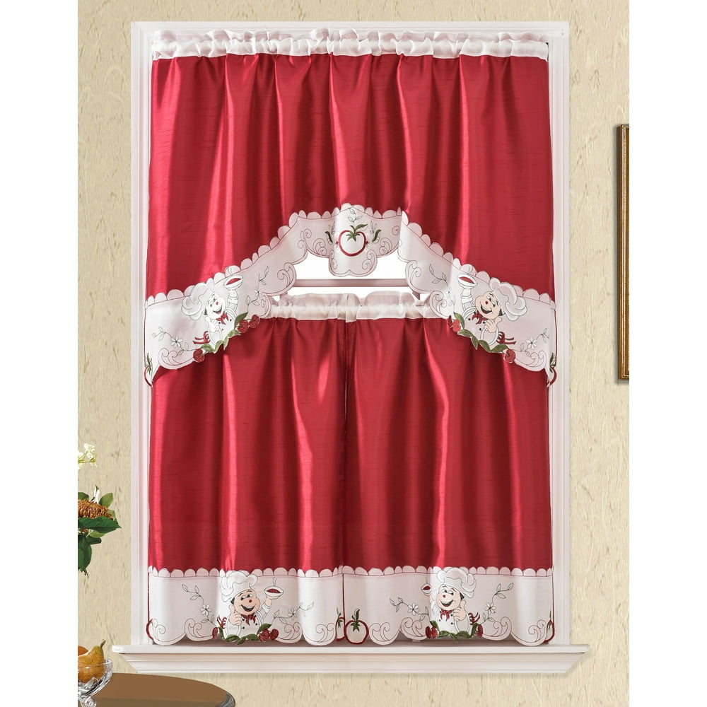 3 Piece Kitchen Curtain Set: 2 Tiers and 1 Valance (Chef) - Walmart.com 3 piece kitchen curtain set. 2 tiers and 1 valance. choose from 7 designs, white curtains with grapes or peaches or apple or fruit or chef or roster print We aim to show you accurate product information. Manufacturers, suppliers and others provide what you see here, and we have not verified it. Specifications Material Polyester Size