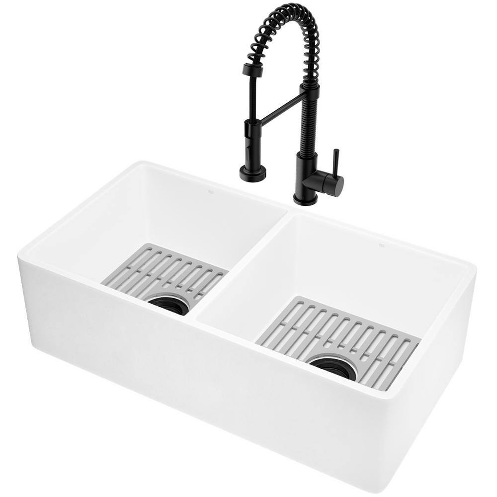 VIGO 27-Inch Crown Apron Front Matte Stone™ Farmhouse Kitchen Sink The durable 27-Inch Crown Apron Front Matte Stone™ Farmhouse Kitchen Sink is the perfect complement to any kitchen. The sink's hand-polished white Matte Stone™ material is scratch, stain, and chip resistant, keeping it smooth to the touch for years to come. The VIGO Crown's reversible apron front allows you to easily customize your kitchen.