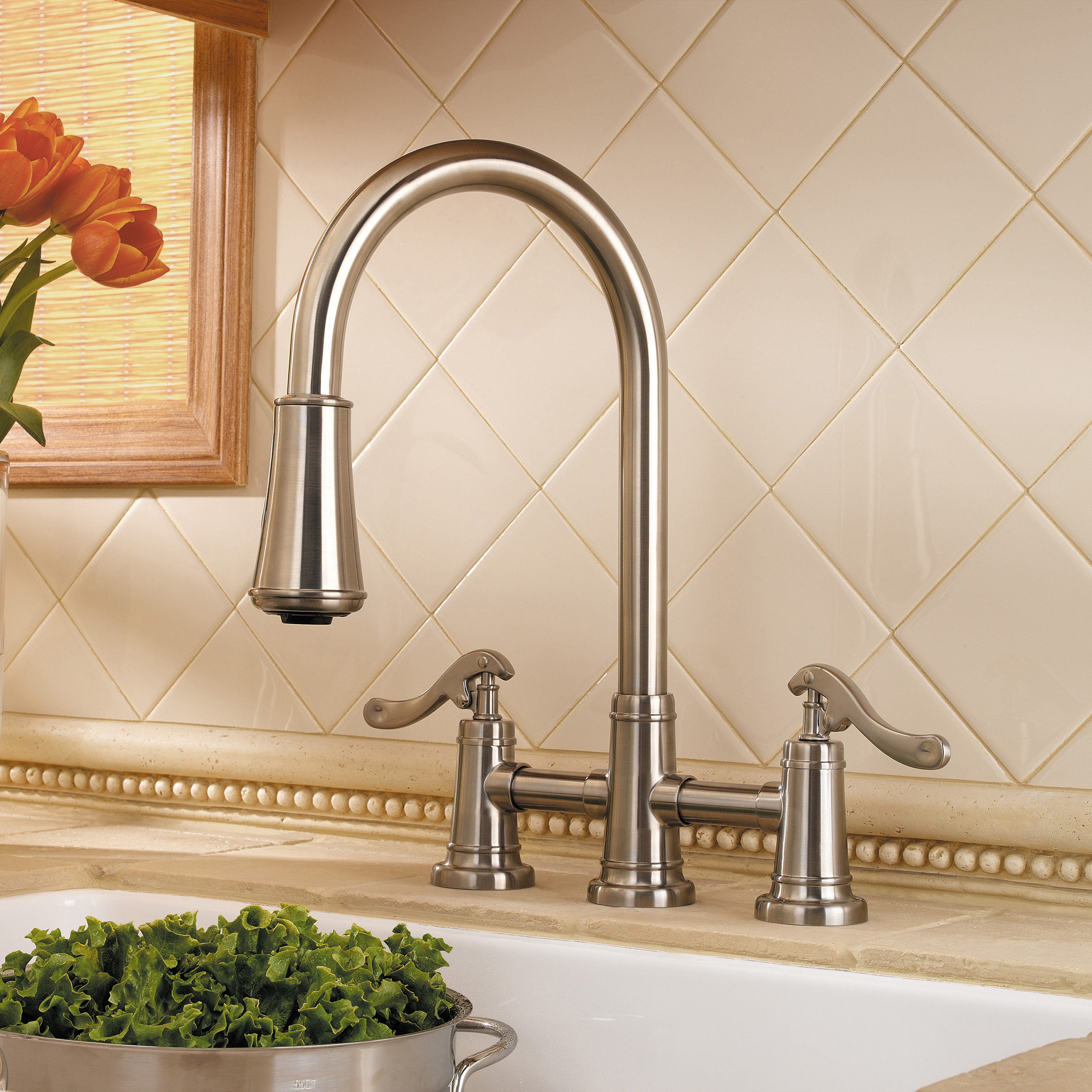 Double Handle Kitchen Faucets at Faucet.com Nio 1.5 GPM Deck Mounted Pull Down Kitchen Faucet with Power Clean, Duralock, Duralast, and Reflex Technology. Available in 4 finishes . $567.83 - $823.35 ... Hurston 1.8 GPM Double Handle Bridge Widespread Pull-Down Kitchen Faucet. Available in 4 finishes . $399.00 - $519.00 (8) ...