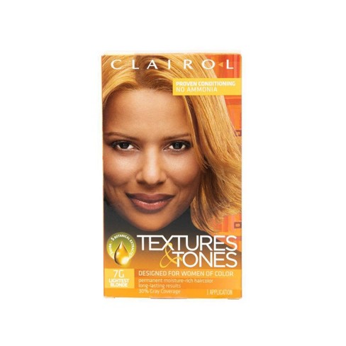 TEXTURES & TONES HAIR COLOR - Hair Motion Intl Corp. Express yourself with Textures & Tones Hair Color. The specially formulated ammonia-free, permanent hair color helps bring out the best of your personal beauty. Warm blondes, Bold brunettes, Radiant reds, this moisture-drenched colors complement all hair textures and skin tones. Features: - Anti-fade formula with natural protein and jojoba Clairol Textures And Tones Hair Color - Blue : Target Texture & Tones luxurious permanent hair color and conditioning system is formulated to provide fade resistant results and moisture conditioning for the hair needs of women of color. This ammonia-free product tones and gives form, complementing all skin tones and hair textures to provide long-lasting color results and 100% gray coverage.
