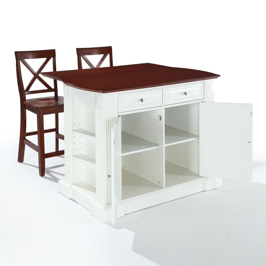 Crosley Furniture - Drop Leaf Breakfast Bar Top Kitchen Island in White Finish with 24" Cherry X-Back Stools - KF300073WH